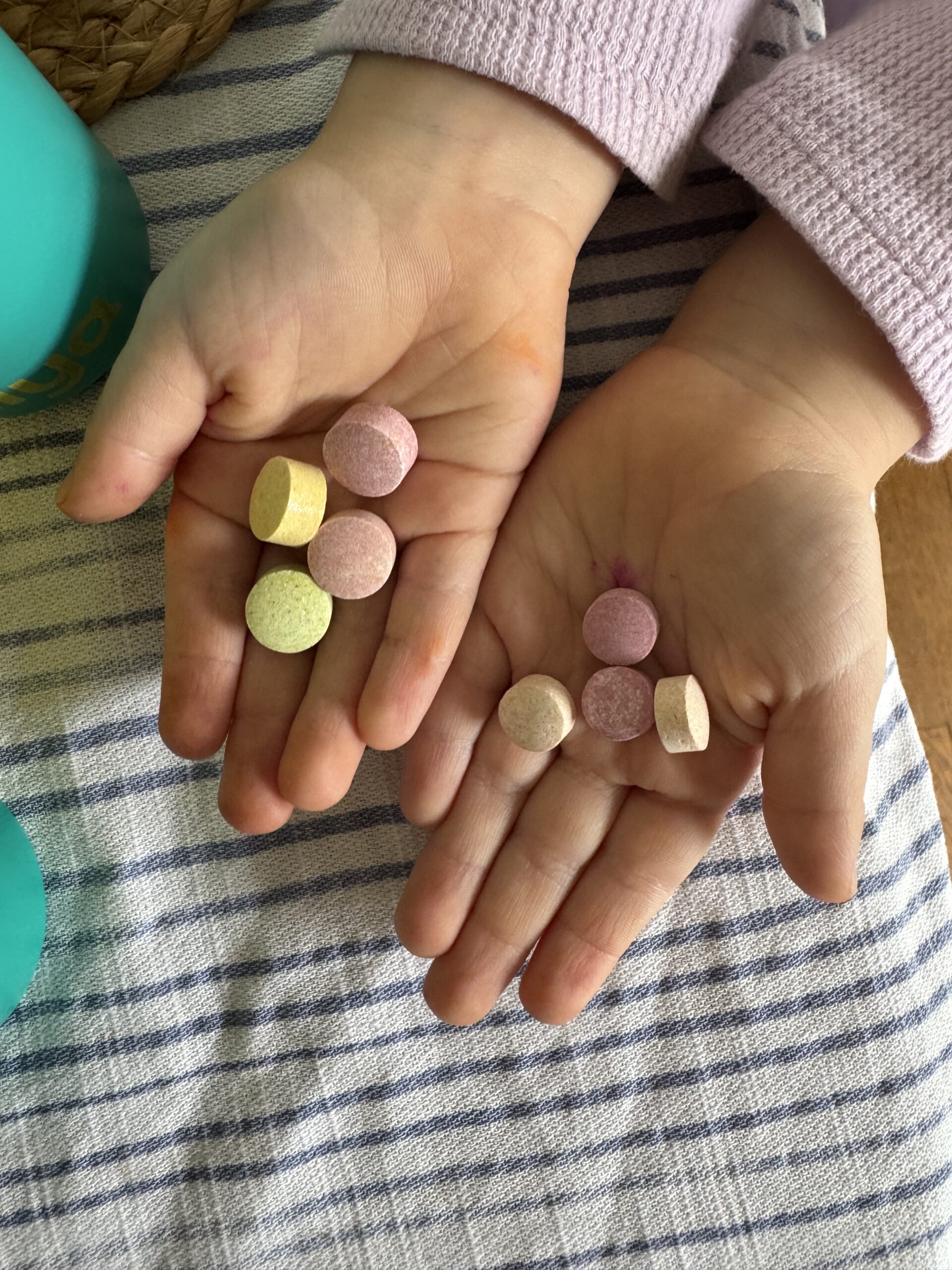 This chewable is essentially a smaller version of the multivitamin, in terms of its color, taste, and texture. Packed with 10 billion live cultures, this tiny supplement supports nutrient absorption, and boosts gut health and immunity. (Plus it is a lot faster and less messy than a bowl of yogurt!) Like the multivitamin, it took us a few days for Poesy to get used to the experience of eating it, but after about a week it was as much a part of her morning routine as choosing which podcast to listen to while getting dressed (PBS’s “Pinkalicious,” in case you were wondering!).